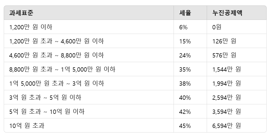 여기서 누진공제란 과세표준이 올라가면서 세율이 높아지는 부담을 줄이기 위해 일정 금액을 공제하는 제도로 약간의 세제 혜택을 받을 수 있습니다.